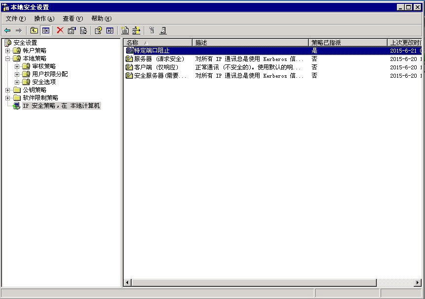 在[本地策略]>[IP安全策略,本地计算机]里面添加一个自定义策略,比如像我叫 [特定端口阻止]