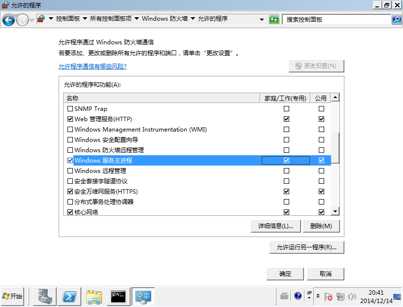 “控制面板”–“Windows防火墙”,点击左边的“允许程序或功能通过Windows防火墙”,在新窗口中点击“允许运行另一程序”。在浏览中找到“C:\Windows\System32\svchost.exe”,打开并添加。这时候会多出一项“Windows服务主进程”,勾选后面的两个复选框,如下图。完成后确认。